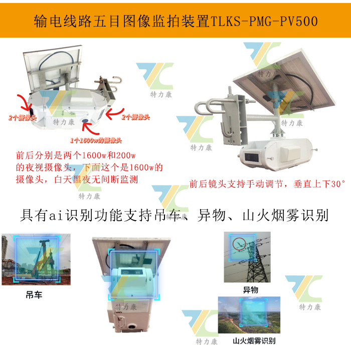 我司研發(fā)的TLKS-PMG-PV500,是一款專為輸電線路設(shè)計(jì)的五目圖像監(jiān)拍裝置。在電力系統(tǒng)中,輸電線路常面臨外部因素導(dǎo)致的潛在威脅,如施工車輛誤觸、塔基損壞等。傳統(tǒng)監(jiān)拍裝置視野受限,難以全面監(jiān)控。TLKS-PMG-PV500通過前后各配置兩個(gè)攝像機(jī)及下方一個(gè)攝像機(jī),實(shí)現(xiàn)了360°無死角監(jiān)控,有效解決了這一問題。