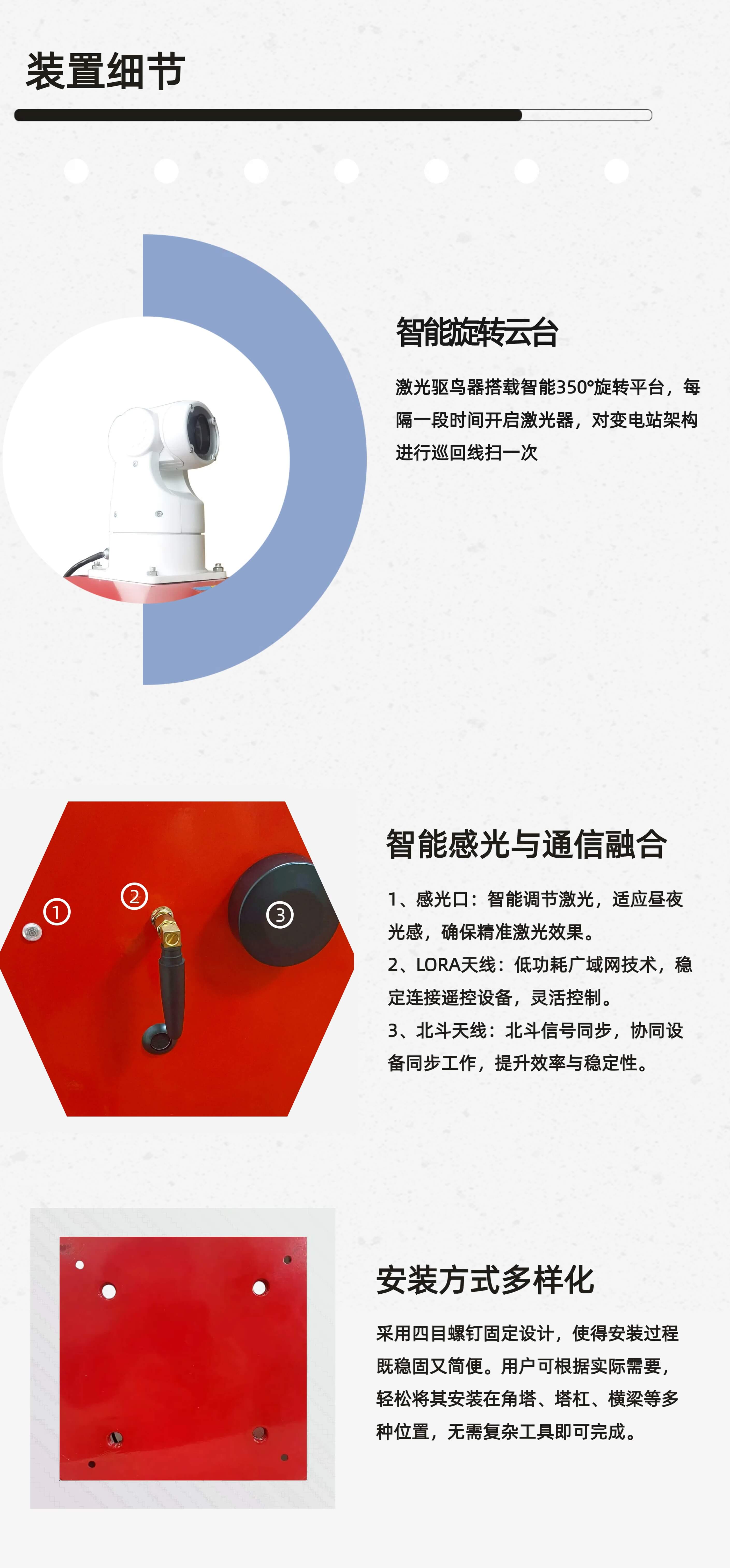 激光驅(qū)鳥器主要由一字線激光器和智能云臺兩個重要部件組成。一字線激光器射出一字線的激光,同市面上大多數(shù)點狀式激光有所不同,一字線對驅(qū)趕變電站架構(gòu)上的鳥類更為方便;激光器裝載在智能云臺上,通過云臺的轉(zhuǎn)動進行掃描。整機具備欠壓過壓保護、遙控器遠程遙控、定時功能、分時控保護激光器的功能,安裝使用簡單方便。
